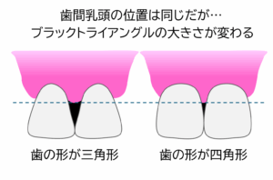 この、歯の形が「三角形の歯」である方は、ブラックトライアングルができやすい状態です。