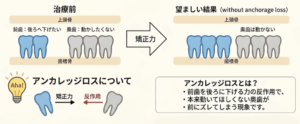 歯を動かすには力が必要ですが、歯の移動は物理学の法則にしたがいます。「動かしたい歯を動かしたとき」に、その反作用として「動かしたくない歯まで動いてしまう」ことがあります。前歯を後ろに動かそうとすると、その反作用で奥歯が前方にズレてしまう——これを「アンカレッジロス(固定源の喪失)」と呼びます。抜歯矯正では大きな移動を伴うため、このアンカレッジ管理が治療の仕上がりに直結します。