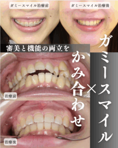 ガミースマイル: 笑った時に歯茎が見えすぎる状態。アンカースクリューで上の前歯を上方に引き上げることで、歯茎の露出を抑えることができます。