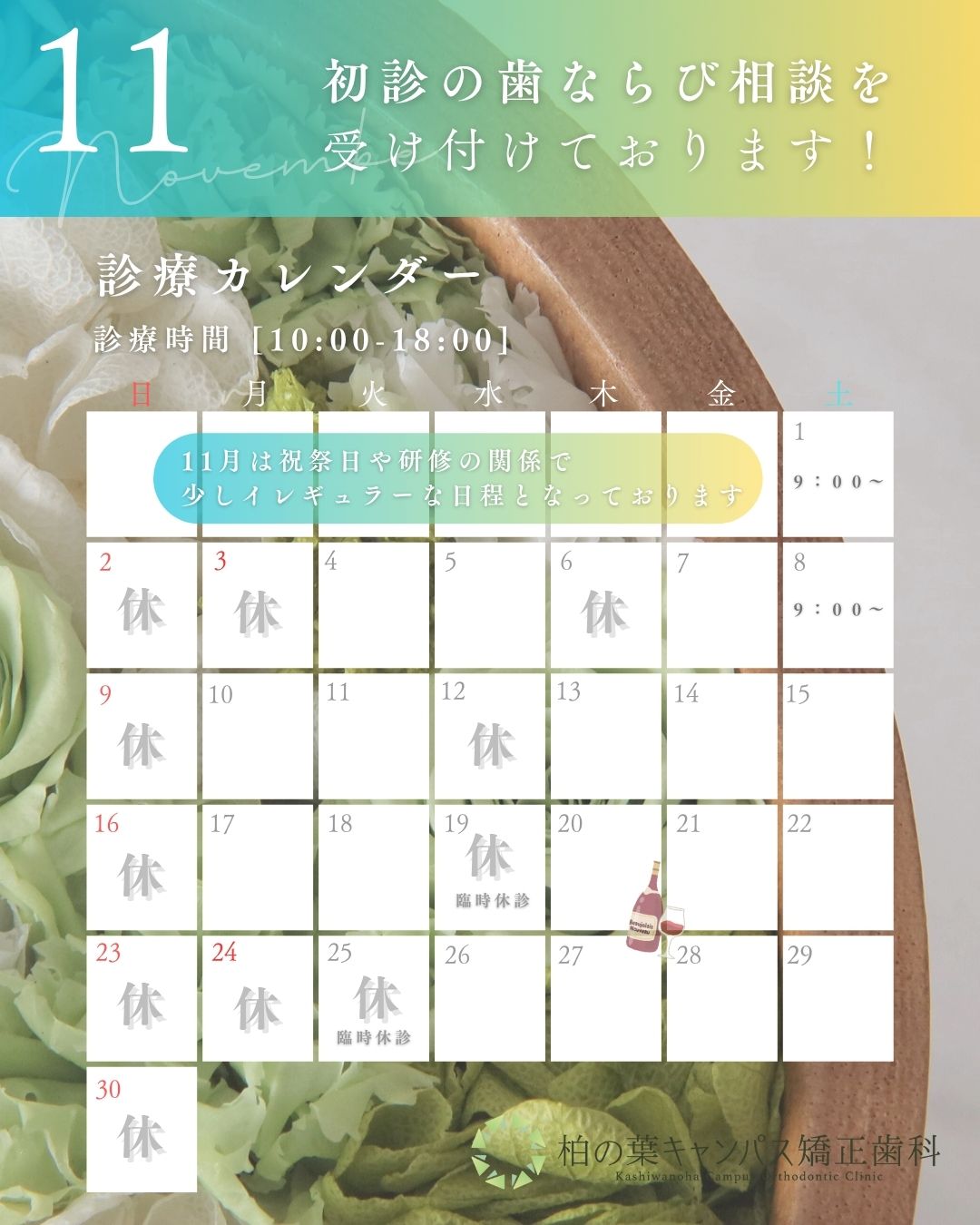 11月の診療カレンダーになります。11月は学会や研修等により、少しイレギュラーな診療日程となっております。ご了承ください。